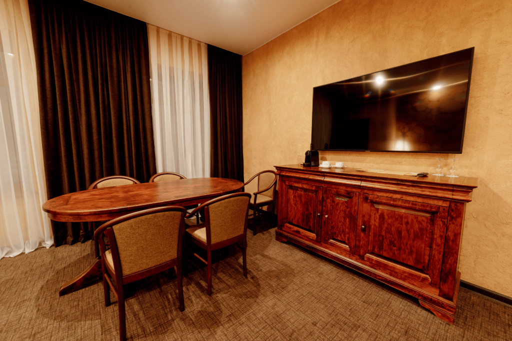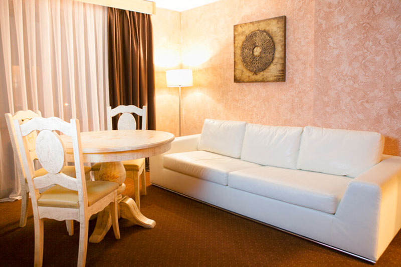 Спальня – одна двуспальная кровать. Гостиная (проходная комната) – раскладной диван. В номере сейф, мини-бар за доп. оплату, плазменный ТВ, в санузле ванная, набор косметики, фен, халаты и тапочки. Возможно поставить 1 доп. место (евро-раскладушка) или 1 детскую кроватку-люльку.