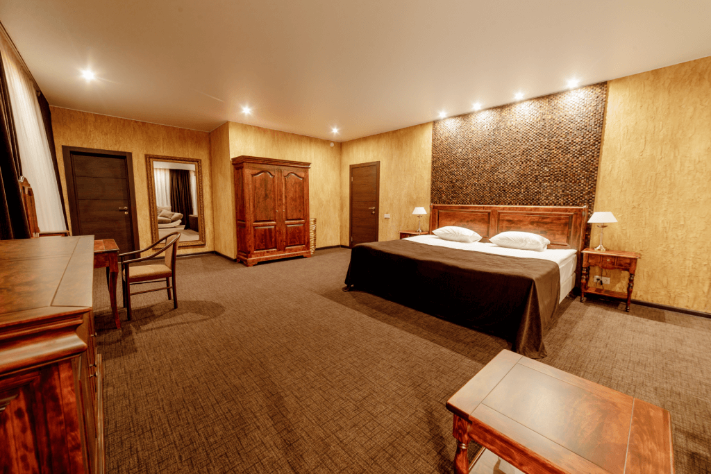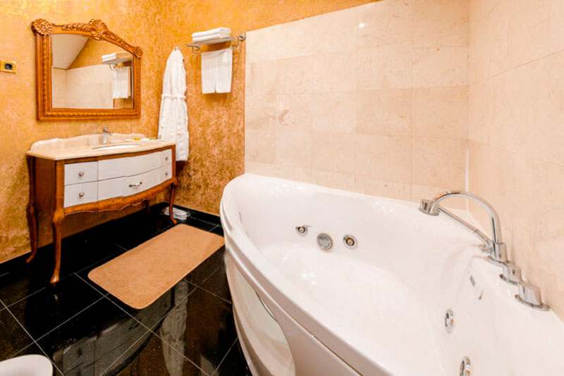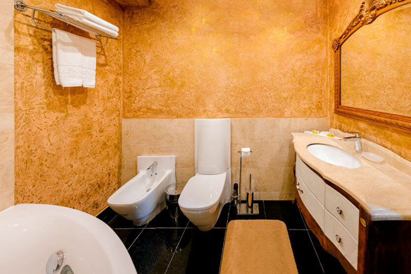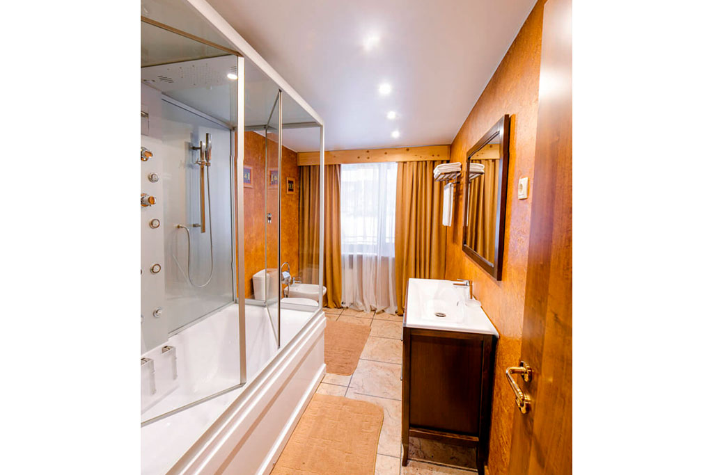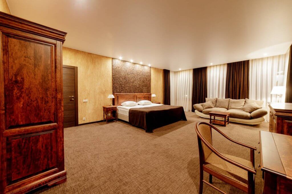 Спальня – одна двуспальная кровать. В номере сейф, мини-бар за доп. оплату, плазменный ТВ, в санузле ванная, набор косметики, фен, халаты и тапочки. Предусмотрена небольшая гардеробная комната. Возможно поставить 1 доп. место (евро-раскладушка) или 1 детскую кроватку-люльку.