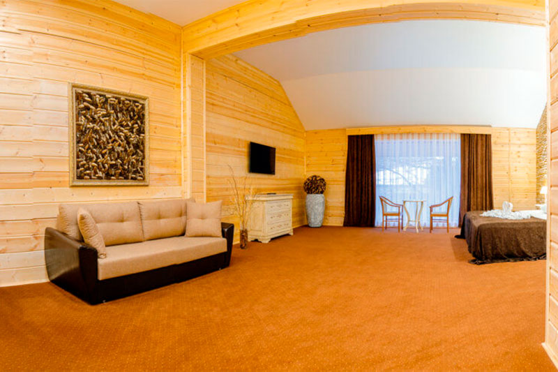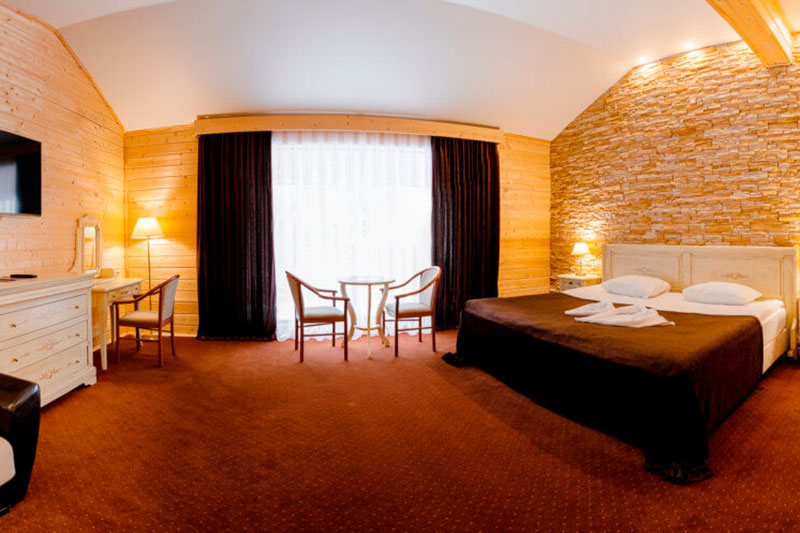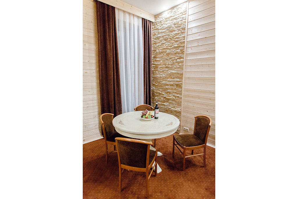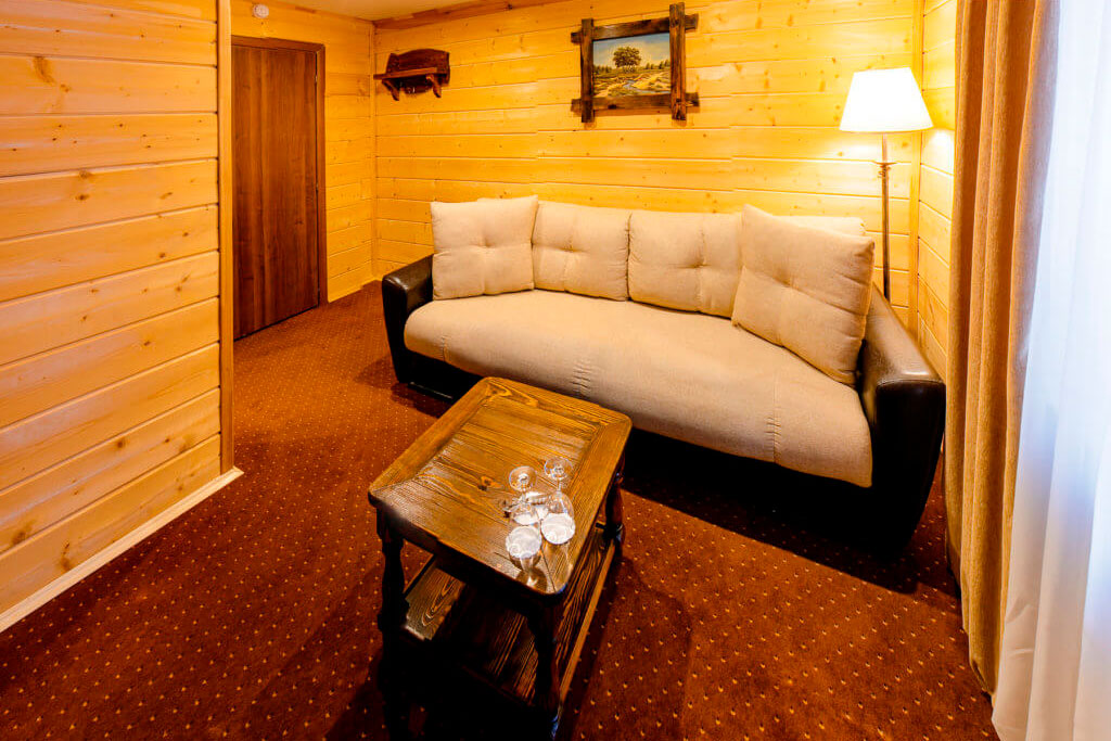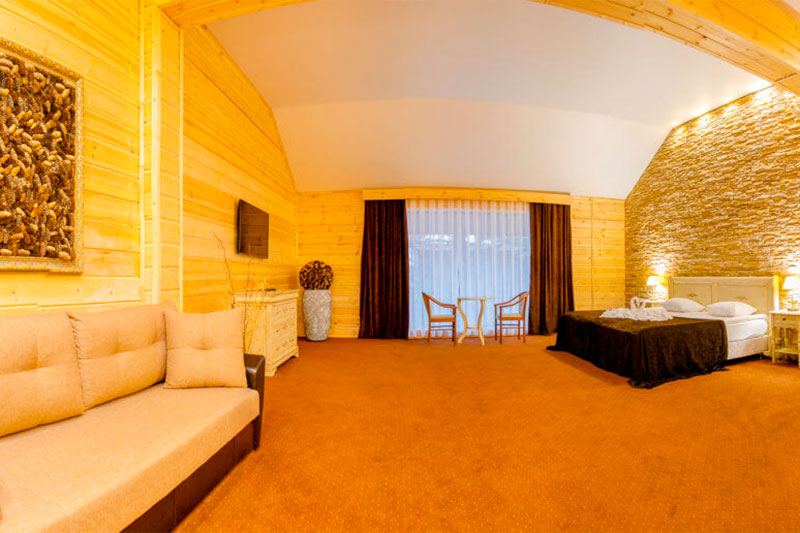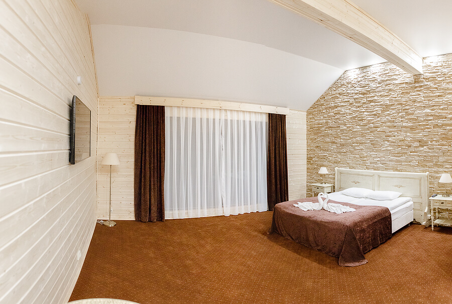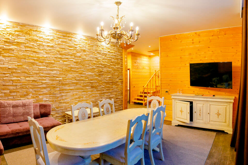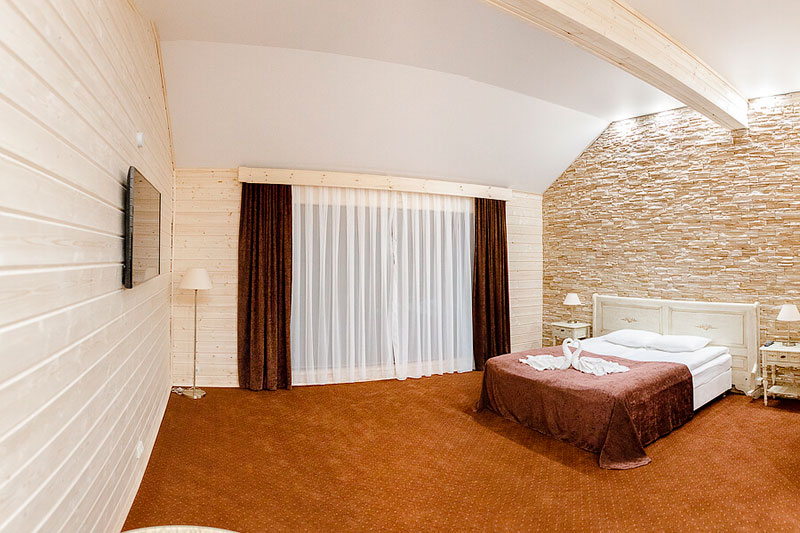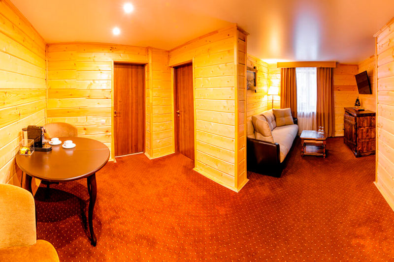 1 этаж: гостиная со столом на 4 персоны, раскладной диван, санузел (ванна, унитаз, биде). 2 этаж: спальня с двуспальной кроватью, раскладной диван, гардеробная и санузел (ванна, унитаз и биде). Возможна установка дополнительного места – еврораскладушки (или детская кроватка-люлька). В номере: сейф, мини-бар, 2 плазменных ТВ (в спальне и в гостиной), два санузла, набор косметики, фен, халаты и тапочки. Теплые полы на 1 и 2 этажах + в санузлах. На втором этаже одно большое центральное окно – не открывается. У каждого номера отдельный вход с улицы.