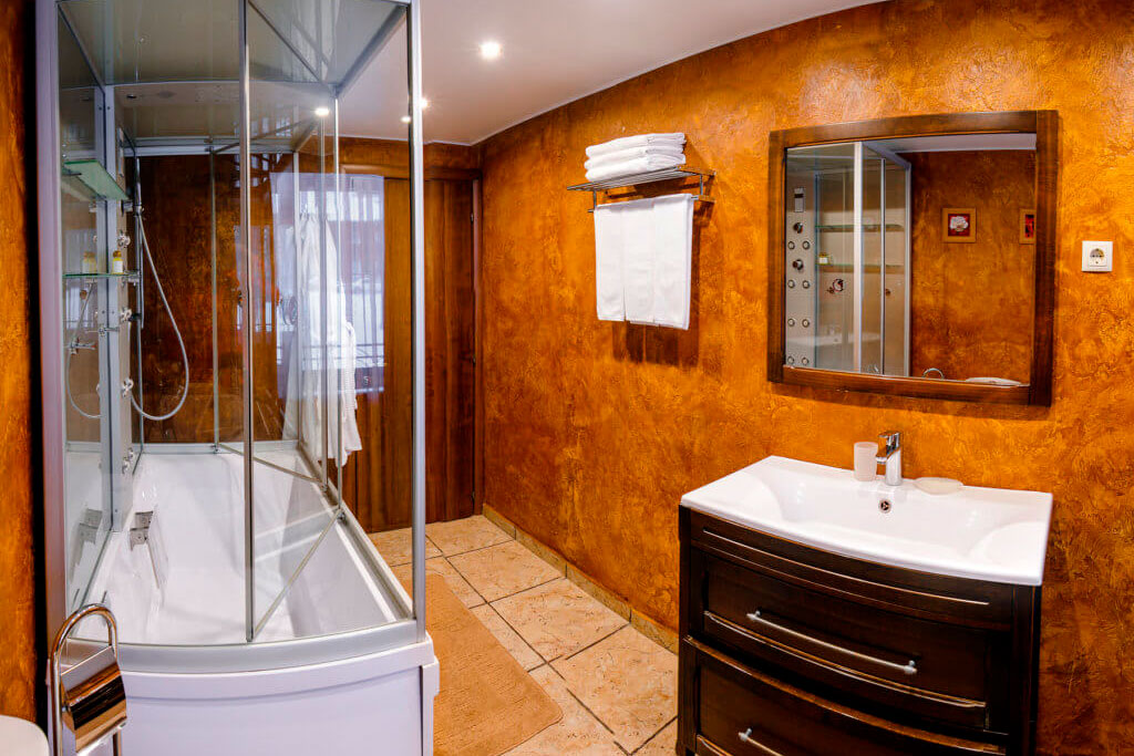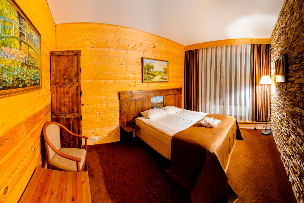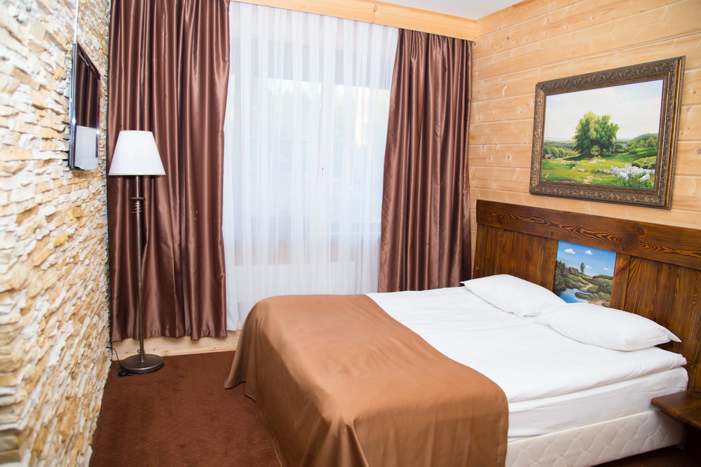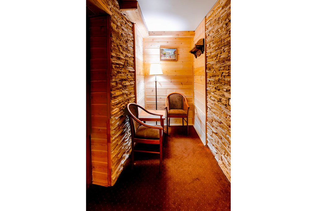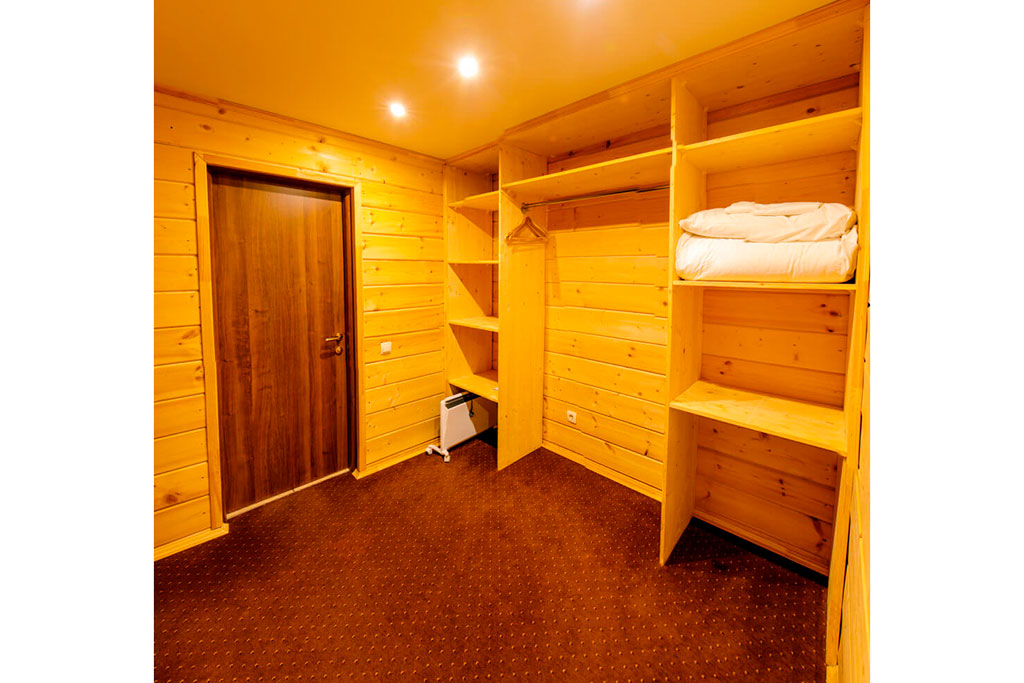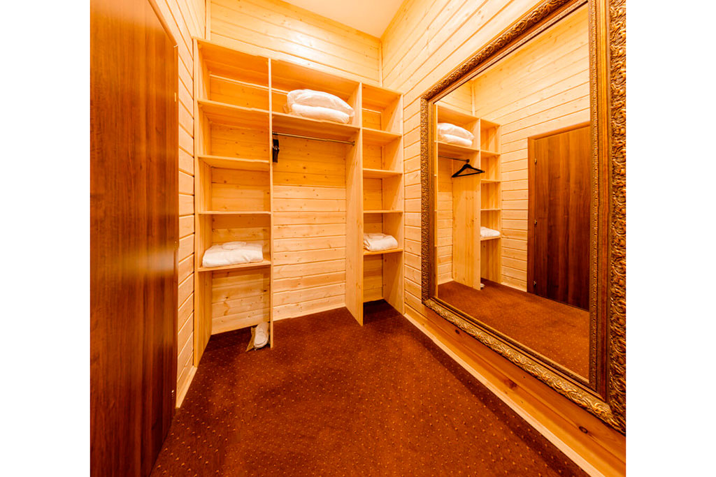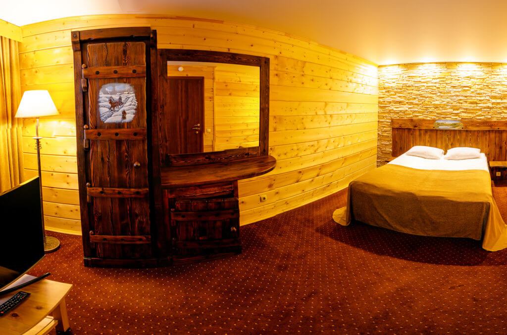 1 этаж: гостиная со столом на 4 персоны, раскладной диван, санузел (ванна, унитаз, биде). 2 этаж: спальня с двуспальной кроватью, раскладной диван, гардеробная и санузел (ванна, унитаз и биде). Возможна установка дополнительного места – еврораскладушки (или детская кроватка-люлька). В номере: сейф, мини-бар, 2 плазменных ТВ (в спальне и в гостиной), два санузла, набор косметики, фен, халаты и тапочки. Теплые полы на 1 и 2 этажах + в санузлах. На втором этаже одно большое центральное окно – не открывается. У каждого номера отдельный вход с улицы.