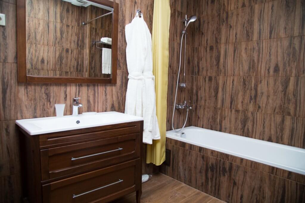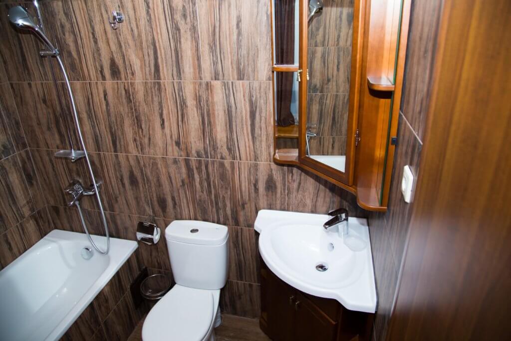 Спальня – одна двуспальная кровать. Гостиная (проходная комната) – раскладной диван. В номере сейф, мини-бар за доп. оплату, 2 плазменных ТВ, в санузле ванная, набор косметики, фен, халаты и тапочки.