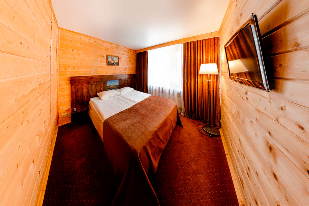 Одна двуспальная кровать. В номере сейф, мини-бар за доп. оплату, плазменный ТВ, маленький столик + 2 стула, в санузле ванная, фен, набор косметики, халаты и тапочки. Просторный санузел с окном. Возможно поставить 1 доп. место (евро-раскладушка) или 1 детскую кроватку-люльку.