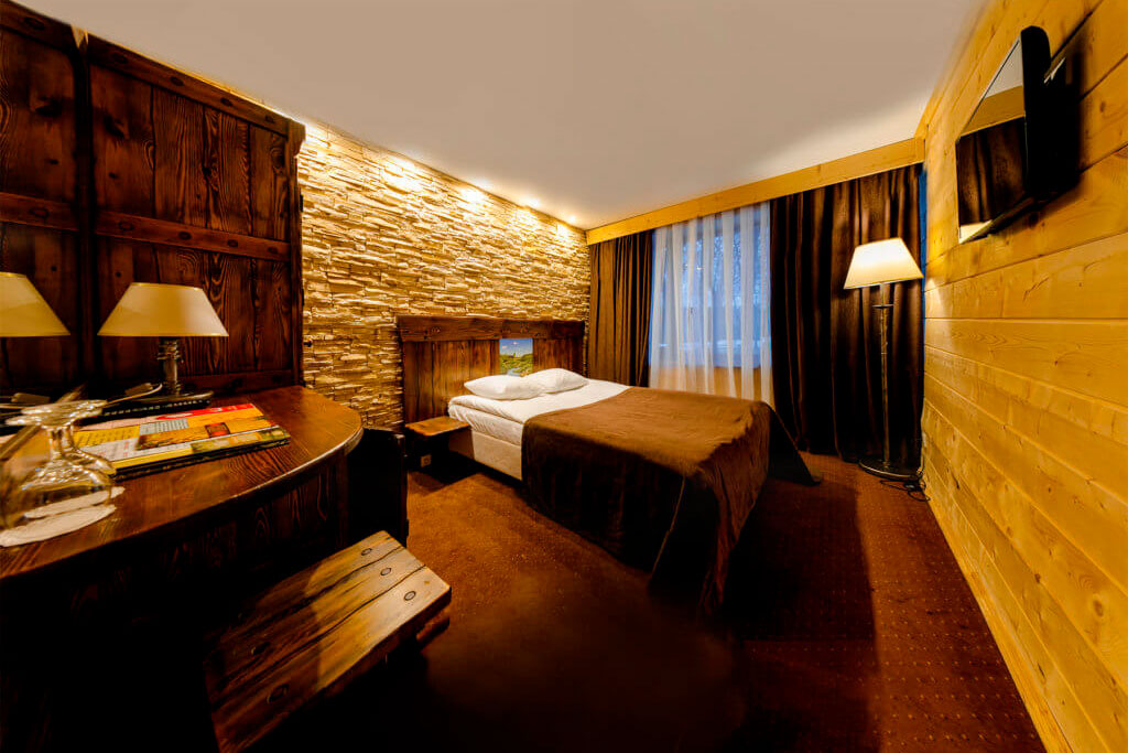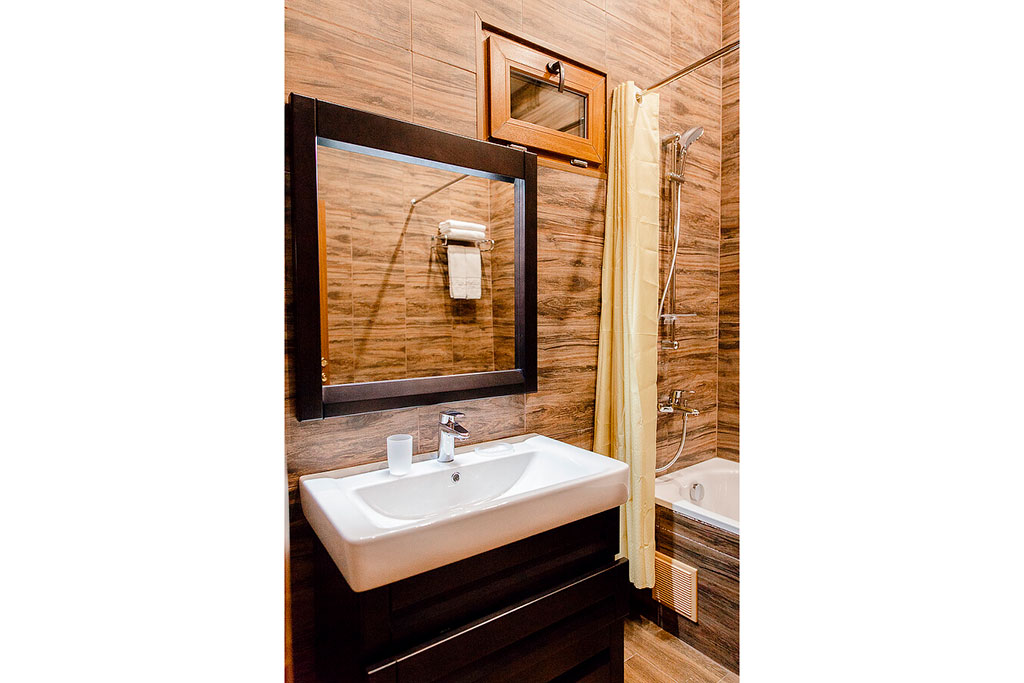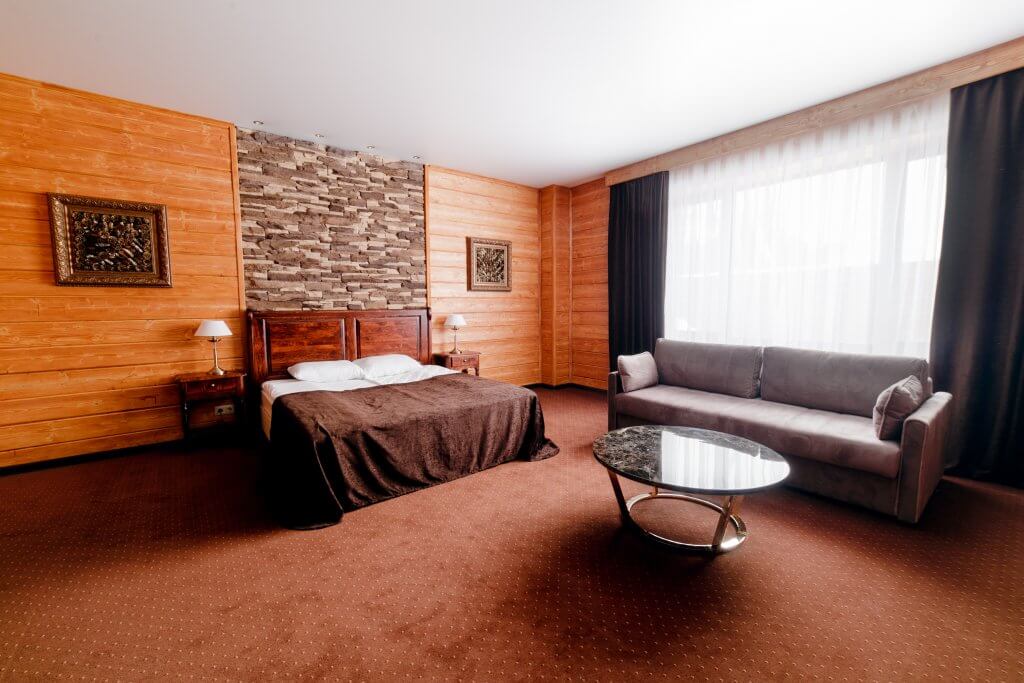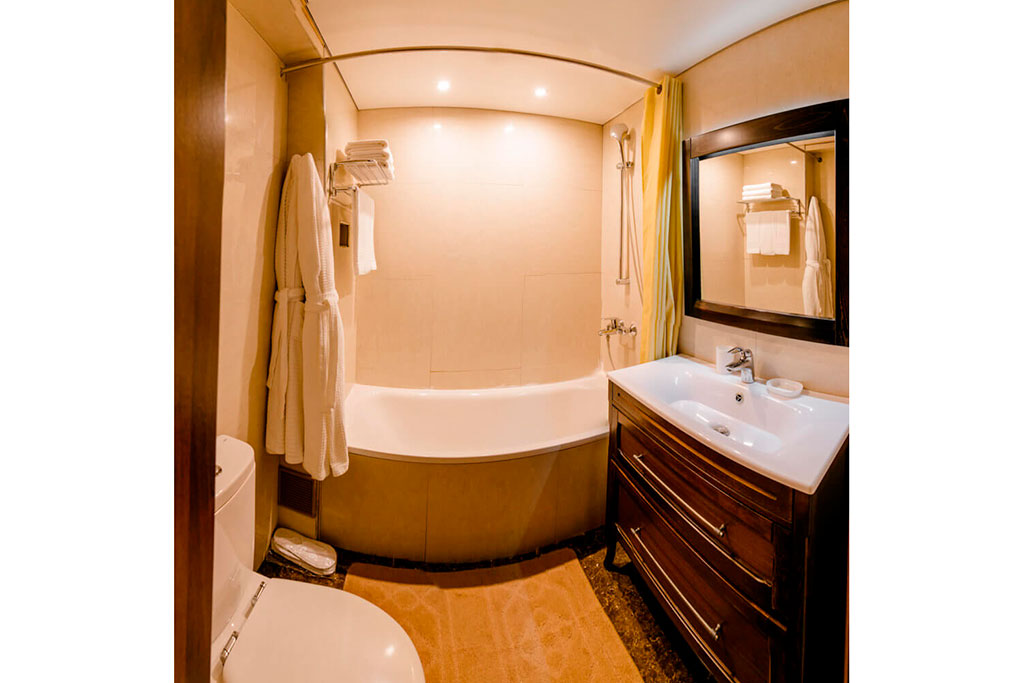 Одна двуспальная кровать и раскладной диван (2 доп. места). В номере сейф, мини-бар за доп. оплату, плазменный ТВ, в санузле ванная, набор косметики, фен, халаты и тапочки. Возможно поставить 1 детскую кроватку-люльку. Номера расположены на 1-3 этажах (лифта нет).