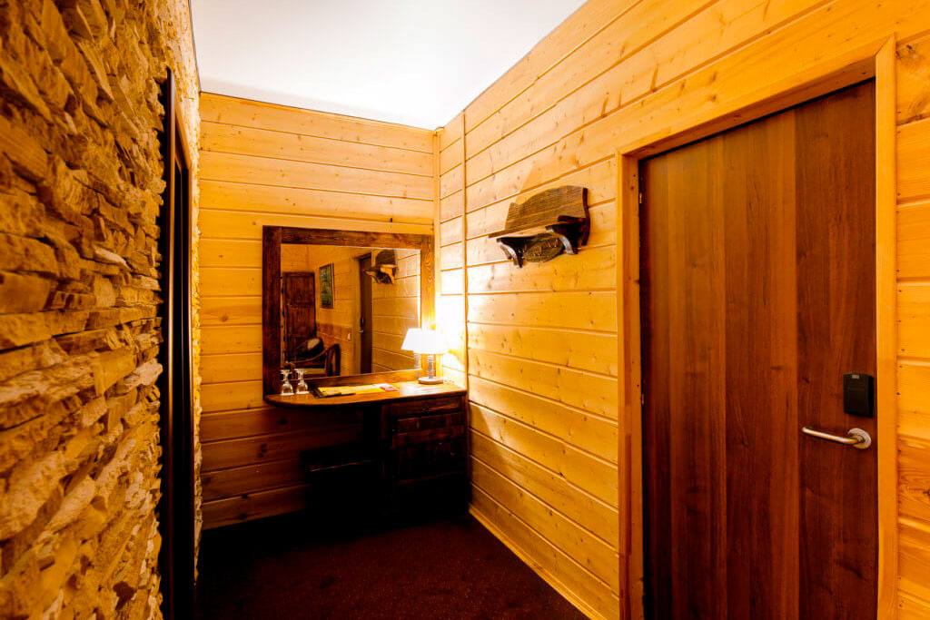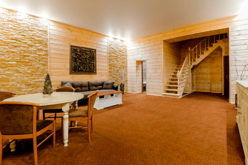 1 этаж: прихожая с зеркалом, зона отдыха с кофейным столиком и стульями, гостиная со столом на 4 персоны, раскладной диван, санузел (ванна, унитаз, биде), гардеробный отсек. 2 этаж: спальня с двуспальной кроватью, раскладной диван, гардеробная и санузел (ванна, унитаз и биде). Возможна установка дополнительного места – еврораскладушки. В номере сейф, мини-бар, 2 плазменных ТВ (в спальне и в гостиной), два санузла, набор косметики, фен, халаты и тапочки. Теплые полы на 1 и 2 этажах + в санузлах. На втором этаже одно большое центральное окно – не открывается. У каждого номера отдельный вход с улицы.